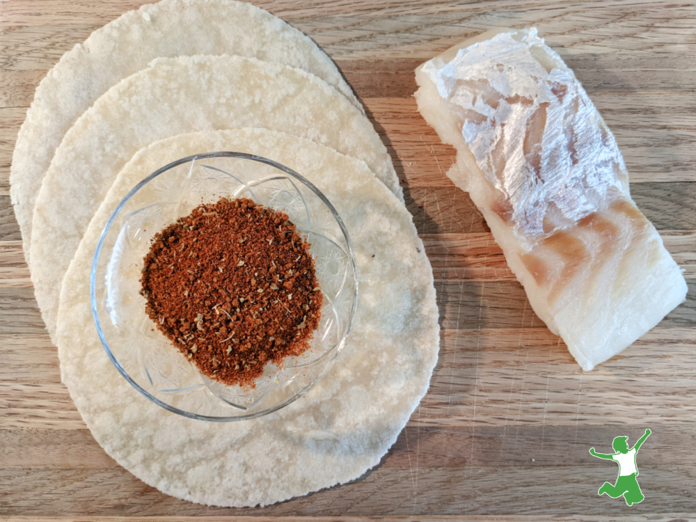 seasoning for fish tacos in a bowl with healthy tortillas and whitefish fillet