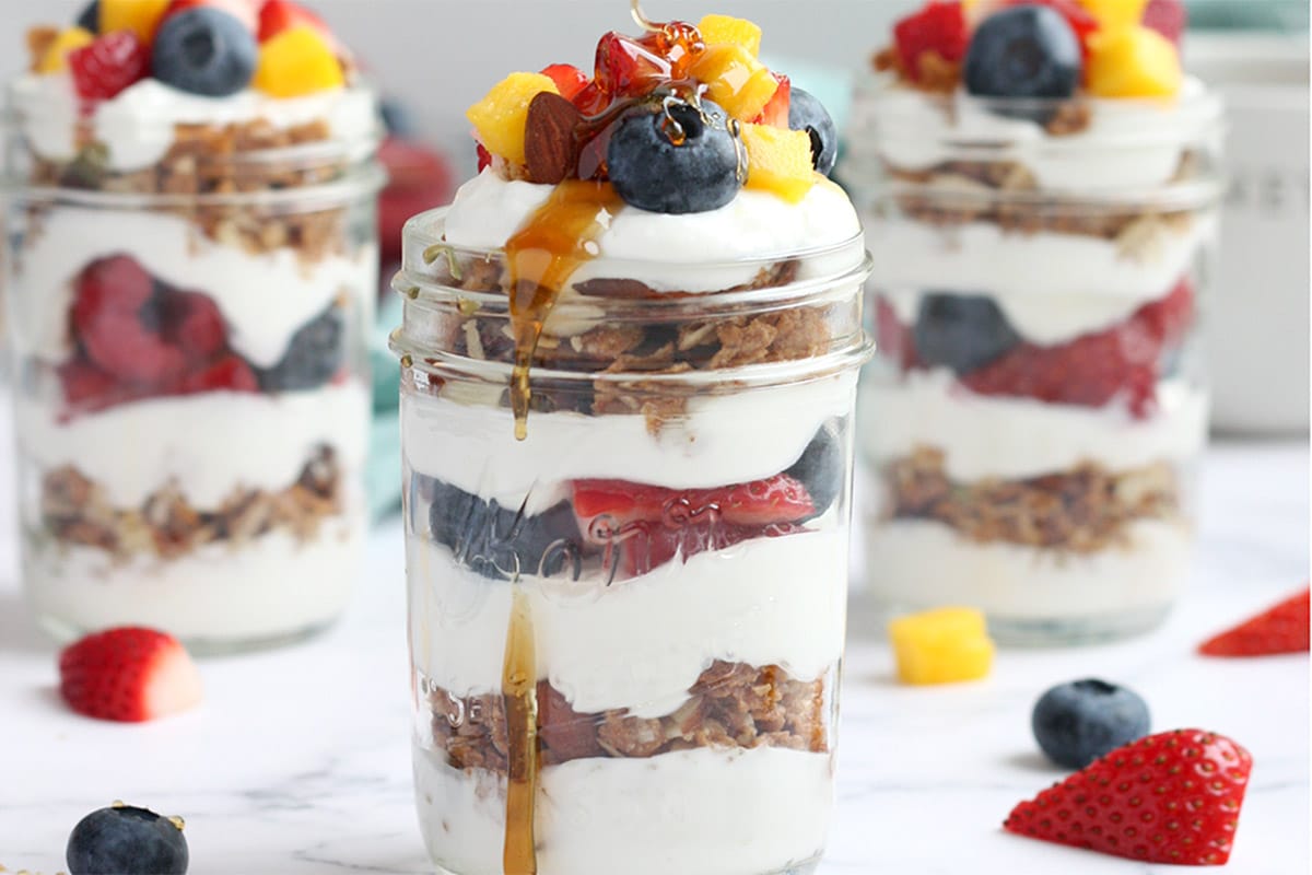Our recipe features whole milk yogurt gently-sweetened with pure maple syrup, and a lower-sugar brand of granola (Bear Naked granola is a solid choice, and you can find it at most supermarkets.)