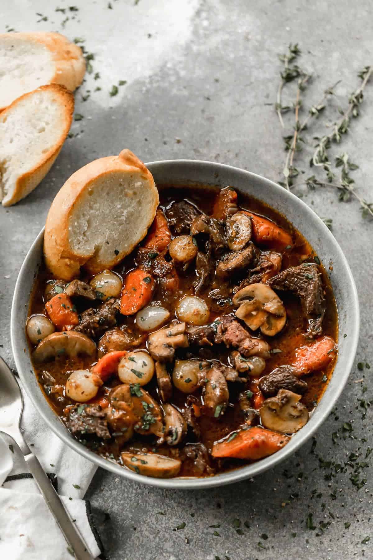 - Stir in the pearl onions and reserved mushrooms. Bring the stew to a boil, then lower the heat and let simmer for 15 minutes. Remove the herb bundle. Taste and adjust salt and pepper as desired. Sprinkle with fresh parsley. Serve hot with toasted baguette slices for soaking up the broth.