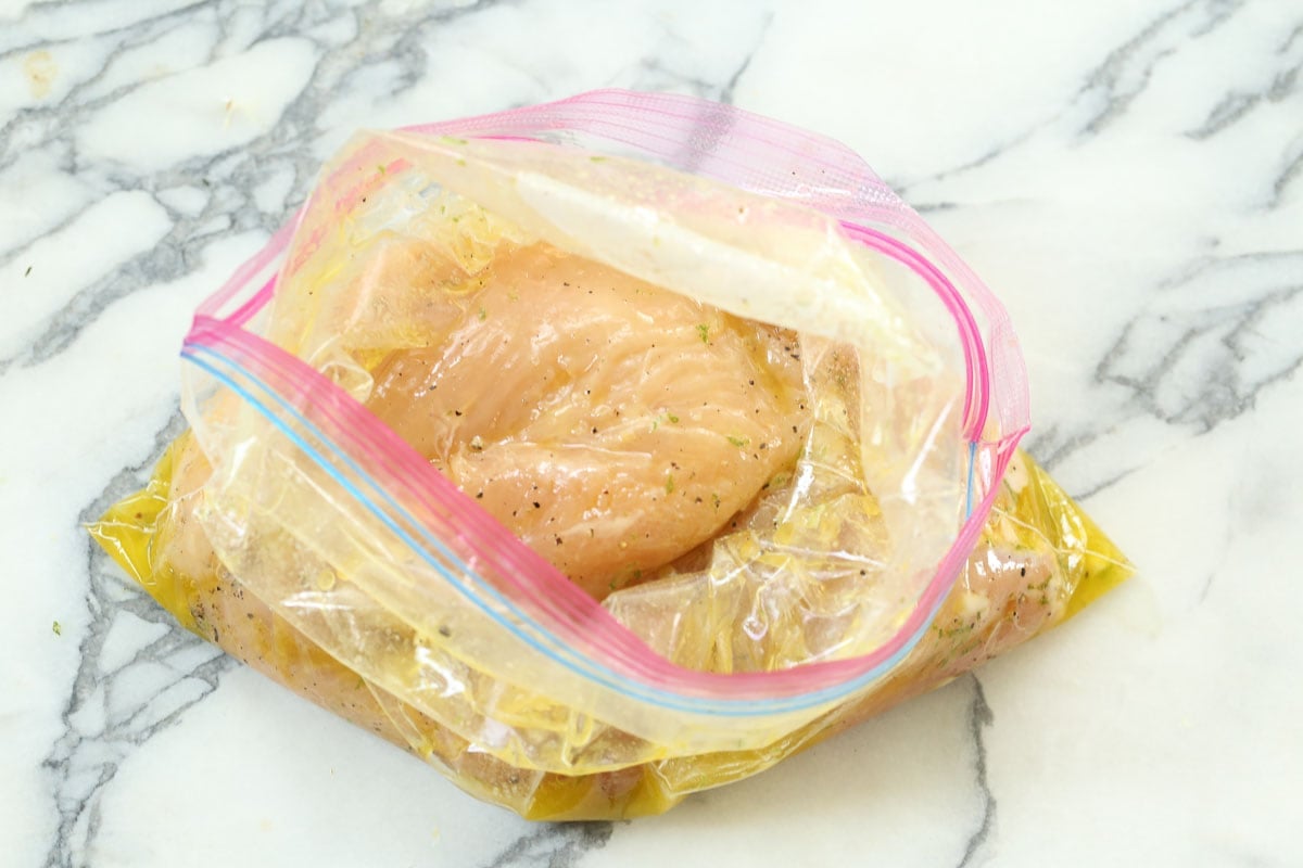 “Squish” the bag to coat the chicken, then place the bag on a plate or inside a shallow baking dish to guard against leaks.